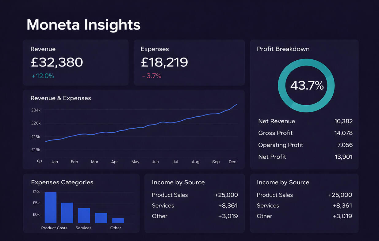 MONETA turns complex financial data into clear, actionable insights. We create precise, structured reports that highlight performance, uncover opportunities, and support confident decision‑making.Whether you’re an individual looking to save smarter and understand where your money goes, or a business aiming to grow with clarity, MONETA brings order, transparency, and strategic focus to your finances.We’re currently welcoming new clients. When you’re ready to move forward with confidence, simply provide your bank statements — we handle everything else.📧: [email protected]
